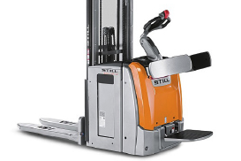 Gerbeur à conducteur accompagnant. Translation et levage, motorisés, manutention sur bras de fourche. Conçu pour charger et décharger un véhicule à quai, Hauteur de levée comprise entre 1,20 m et 2,50 m.